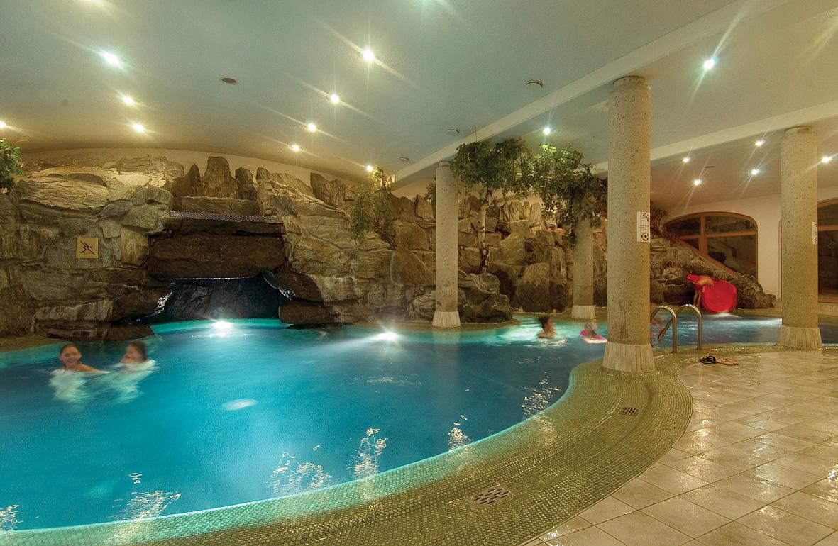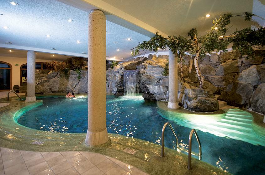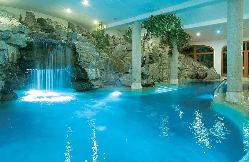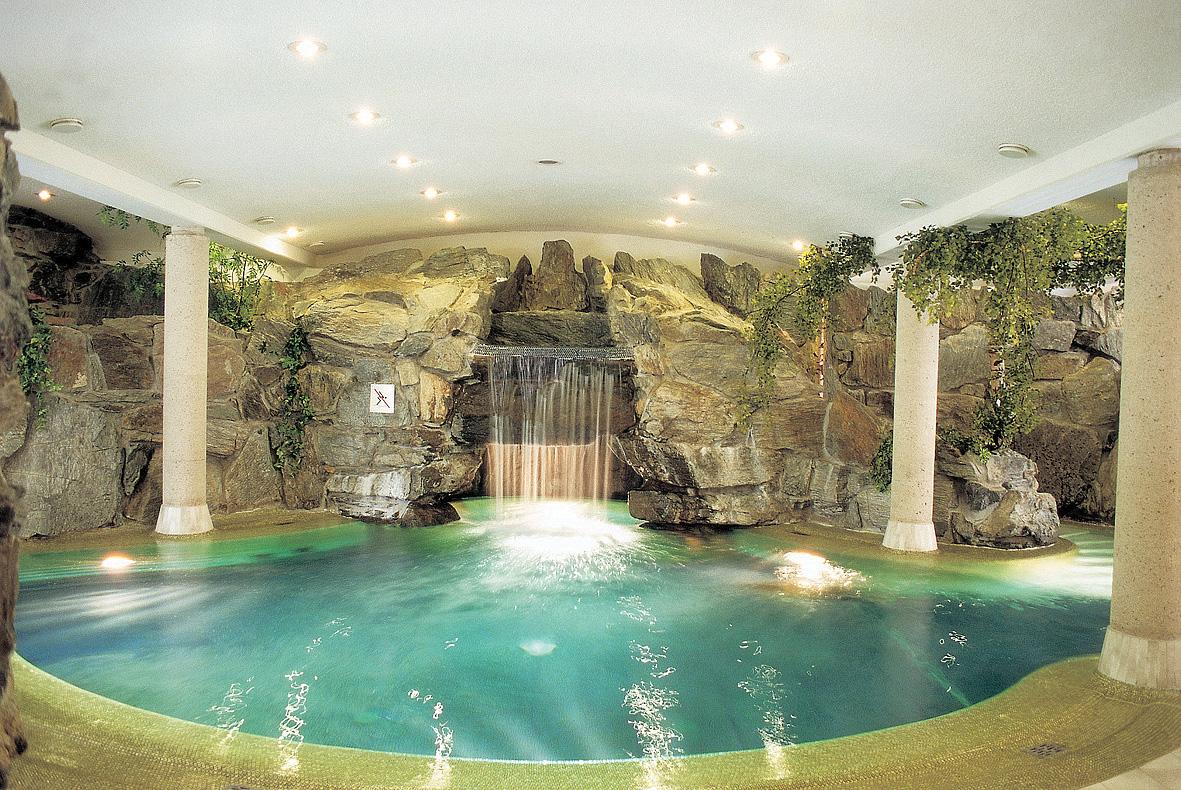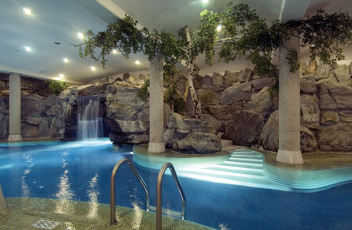 bazén s umelým vodopádom a šmýkľavkou, fínska sauna, horizontálne